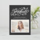 Rustic and whimsical graduation photo invitation featuring modern calligraphy, leaves accents, and faux chalkboard background. This design is available in variety of colors.