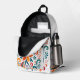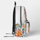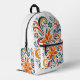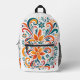 This backpack features a luxurious pattern of floral swirls painted in vibrant shades of orange, teal, red, and green, dancing across a crisp white fabric.