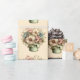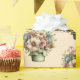 Wrapping paper with a cute image. Blue. pink and cream colored flowers with green leaves. Set inside a green flower pot with a green plaid cloth hanging over the side.