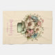 A kitchen towel with a cute image. Blue. pink and cream coloured flowers with green leaves. Set inside a green flower pot with a green plaid cloth hanging over the side.