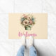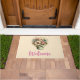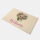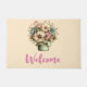 Welcome doormat with a cute image. Blue. pink and cream coloured flowers with green leaves. Set inside a green flower pot with a green plaid cloth hanging over the side.