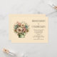 A wedding invitation with a cute image. Blue. pink and cream coloured flowers with green leaves. Set inside a green flower pot with a green plaid cloth hanging over the side.