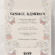 This whimsical yet elegant wedding design has been adapted from an original vintage, Art Nouveau illustration. The wildflowers, mushrooms, frogs, and leaves wrap their way around the entire border of the invitation, making this perfect for an outdoor, magical, or cottagecore event. Hints of champagne and muted reds add to the earthy vibe.