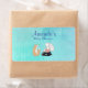 A cute and whimsical cartoon sketch drawing with a fox and rabbit sitting together, hanging out. The white rabbit has peach coloured shorts and is sitting on a mushroom covered log. The brown fox is looking up at his long-eared rabbit friend. The background is a turquoise blue texture with paintbrush streaks. Personalise with a name and event title such as baby shower, birthday, wedding etc...