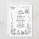 This whimsical black-and-white wedding invitation is bursting with playful charm and hand-drawn personality. Featuring a fun doodle-style illustration theme, the design includes delightful sketches like wedding rings tied with a bow, disco ball, champagne flutes, music notes, hearts, candles, a layered cake, a wine bottle, seafood, and more — all wrapped in a loose, flowing border that gives it a casual, creative vibe.