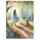 This enchanting artwork captures a dreamy woodland scene where a young girl in a flowing, vintage-style dress dances down a sun-dappled forest path. Surrounded by soft birch trees, delicate foxgloves, and glowing wildflowers, the mood is pure cottagecore—peaceful, nostalgic, and full of wonder. Gentle pastel tones of lavender, sage, and blush pink mingle with golden sunlight and deep forest greens to create a whimsical, storybook-like atmosphere. The watercolor style adds an ethereal softness, as if the whole scene were lifted from a fairytale memory. It's a timeless blend of nature, femininity, and quiet magic. AI generated artwork.