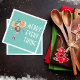 Whimsical ginger haired girl decked out in cute colourful winter outfit with white stacked "Merry Everything" text on aqua background.