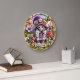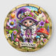 This enchanting round clock features a beautifully illustrated whimsical scene, perfect for a welcoming touch to any space in Sydney. A cute gnome girl with white braided hair and a purple floral hat and dress stands amidst a vibrant garden filled with colourful flowers, mushrooms, and fluttering butterflies under a soft blue and pink sky. A banner at the bottom sweetly reads "WELCOME". The clock has a decorative gold-coloured frame, enhancing its charming and fantasy-inspired aesthetic.