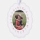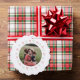 A whimsical holiday photo ornament card with a circular frame of red and green hand drawn bows. On the reverse is your headline in vintage style handwriting font.