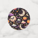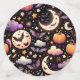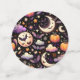 A magical Halloween night unfolds in this whimsical pattern, filled with glowing crescent moons, playful bats, and radiant stars set against a deep black sky. Bright orange pumpkins, swirling clouds in shades of purple and grey, and delicate spiderwebs weave together a lively yet enchanting scene. The design blends spooky charm with a dreamy storybook feel, perfect for evoking festive autumn nights and imaginative seasonal whimsy. AI generated artwork.