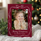Send joyful greetings with this Whimsical Hand-Drawn Bow Frame 2 Photo Holiday Card. The front showcases your photo framed by a playful hand-drawn white border with a bow at the top, set against a rich burgundy background. “Merry Christmas” is displayed in elegant handwritten white script with your family name shown below. The back includes a second photo and your holiday message, creating a festive and elegant Christmas card.