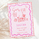 This trendy hand drawn style illustrated wedding save the date invitation features a scribble bow and dinner table elements. The whimsical and quirky design includes handwritten font and celebration doodles. Pink and red colours for classic yet modern wedding stationary.