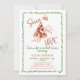 Green and red slice of love bridal shower invitation featuring a slice of pizza and two hands illustration, red text heading and a quirky green frame border.
