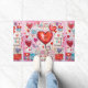 A doormat with a whimsical pattern. Scrapbook style doodles and scribbles. Red and pink hearts and various letters and envelopes scattered all around.