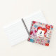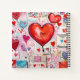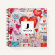 Spiral notebook with a whimsical pattern. Scrapbook style doodles and scribbles. Red and pink hearts and various letters and envelopes scattered all around.