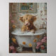 Add a splash of whimsy to your walls with this charming art print featuring a highland cow enjoying a relaxing bubble bath in a vintage clawfoot tub. Surrounded by floral wallpaper, cheerful blooms, and sudsy bubbles, this playful scene blends farmhouse charm with cosy cottagecore vibes. Perfect for bathroom decor, farmhouse homes, or as a humourous gift for cow lovers, this print brings smiles and style to any space.