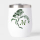 An illustration of a whimsical hooded grasshopper with facial hair. The insect is perched on grass. The grass is curled down in circle shape make a frame around a M. M is short for monogram and can be personalised for your own initial.