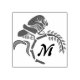 An illustration of a whimsical hooded grasshopper with facial hair. The insect is perched on grass. The grass is curled down in circle shape make a frame around a M. M is short for monogram and can be personalised for your own initial.
