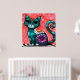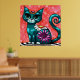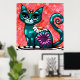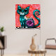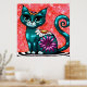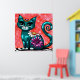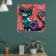 Whimsical Kitty Cat Sitting on Rug Floral Teal Poster