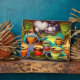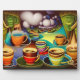 Whimsical surreal AI generated digital art dreamscape tabletop art plaque features colourful cups filled with coffee.