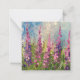 Step into a painted dream with this notecard that depicts a whimsical field of lavender and wildflowers. The expressive brush strokes and lively splatters bring a dynamic and playful feel to the serene landscape, making it an enchanting choice for personal notes or invitations.