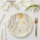 This paper plate features stylised purple flowers resembling lavender paired with delicate yellow blossoms on fine stems. Set against a light, creamy background, the design is accented with soft yellow-orange circles and scattered speckles, creating a whimsical, painterly effect. With its gentle blend of floral detail and abstract watercolor shapes, the pattern exudes a dreamy, sunlit charm—perfect for spring and summer-inspired designs.