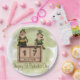 Whimsical design features two leprechauns perched on calendar cube for March 17th, with moss green watercolor wash background and customisable "Happy St. Patrick's Day" text in handwritten style brown font.