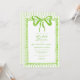 This whimsical bridal shower invitation features a bright lime green watercolor bow and a playful scalloped rectangle frame against a classic lime green and white striped background. Perfect for a shower with a preppy or coastal aesthetic, this charming design provides a sweet, hand-painted look for your special celebration. Created by Simply Farmhouse Press.