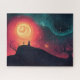 A dreamlike fantasy scene with a child on a hill under a glowing surreal sun and swirling cosmic sky, symbolising wonder and imagination. This is a great design for artful and colourful puzzle lovers.