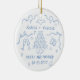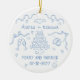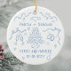 Personalised first christmas wedding ornament, designed in a romantic whimsical doodle style. With the text "Merry and married". Featuring hand-drawn details like champagne glasses, hearts, a wedding cake, an engagement ring, and sweet bows with swirly ribbons, it’s a charming keepsake to remember your engagement year. Add your names and engagement date. All colours can be customised in the design tool, making it easy to match your style or holiday décor. A thoughtful gift for couples, fiancés, or as a special Christmas tree memory to treasure for years to come.