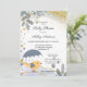 A cute baby shower invitation featuring an artistic design with whimsical bird with umbrella in modern colors.
