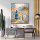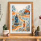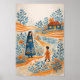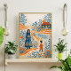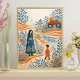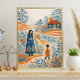 Rendered in a textured, vintage storybook style with calming blue and warm orange tones, the design brings a nostalgic and comforting atmosphere to any space. The flowing paths, stylized plants, and gentle figures create a dreamy narrative scene reminiscent of classic children's book illustrations and traditional folk art.