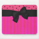 Pretty pink and black mouse pad done in stripes and polka dots, with a big pretty black ribbon and bow going across the width of the mouse pad. Very pretty for at home or at the office.