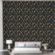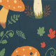 A charming seamless pattern featuring red and orange mushrooms, autumn leaves, and green vines on a dark background. Perfect for nature-themed designs, fall decor, or whimsical projects.