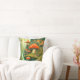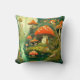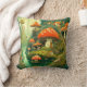 The front of this pillow is an illustration of a mushroom village with red and white amanita mushrooms and a worn wooden staircase leading up a hill, all in a forest of varying hues of green. The back of the pillow is green.