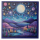 Ceramic tile with a beautiful illustration. Whimsical and fanciful vibe. A big glowing moon with stars all around. Hanging over a lovely landscape of trees, mountains and a winding river. Awesome magical mystical vibe.