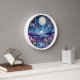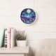 A clock with a beautiful illustration. Whimsical and fanciful vibe. A big glowing moon with stars all around. Hanging over a lovely landscape of trees, mountains and a winding river. Awesome magical mystical vibe.