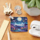 Personalised keychain with a beautiful illustration. Whimsical and fanciful vibe. A big glowing moon with stars all around. Hanging over a lovely landscape of trees, mountains and a winding river. Awesome magical mystical vibe.