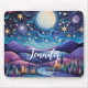 Mousepad with a beautiful illustration. Whimsical and fanciful vibe. A big glowing moon with stars all around. Hanging over a lovely landscape of trees, mountains and a winding river. Awesome magical mystical vibe.