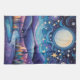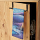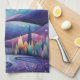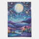Kitchen towel with a beautiful illustration. Whimsical and fanciful vibe. A big glowing moon with stars all around. Hanging over a lovely landscape of trees, mountains and a winding river. Awesome magical mystical vibe.