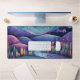 Desk mat with a beautiful illustration. Whimsical and fanciful vibe. A lovely landscape of trees, mountains and a winding river. Mystical vibe.