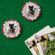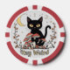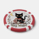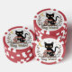 Whimsical noir cat framed by red mushrooms and pal poker chips