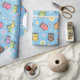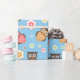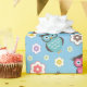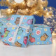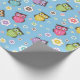 A playful and colourful seamless pattern featuring cartoon owls in various bright colours such as pink, orange, green, brown, and blue. The owls are surrounded by a mix of small, multicolored flowers on a soft blue background, creating a cheerful and whimsical design. Perfect for children's products.
