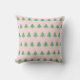 A pattern of green Christmas trees appears on this pale pink throw pillow.