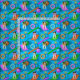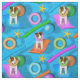 This fun and colourful Jack Russell / Parson Russell themed fabric features four illustrated terriers, each one standing on a floating mat in a crystal clear swimming pool with a tennis ball at her feet and wearing a colourful swim ring around her neck - the dogs have varied black and brown head and body markings, and each is tilting her head whimsically - the dogs are surrounded by various colourful pool toys, and you can see the shadows on the bottom of the pool - Jack Russell Terriers pool party pattern © katz_d_zynes 2019 | you may like a new version of this pattern where the dogs are not wearing swim rings | see it here https://www.zazzle.com/another_parson_jack_russell_terrier_pool_party_fabric-256250386588949971