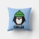 Whimsical penguin cartoon throw pillow | chillax. Funny arctic animal bird design with green hat and humourous quote. Cute gift idea for penguin lover, teenager and smaller kids. Home decor.