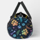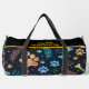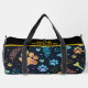 This unique duffle bag features a whimsical colourful pattern on a black background, showcasing various coloured paw prints, bones, and leafy details. It's a practical pet accessory and versatile organiser for travel and everyday use.