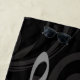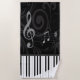 A whimsical musical design with curved piano keyboard keys and musical notes on a subtle flourish pattern in grey on a black background. Ideal for the pianist, piano student or the piano lover.