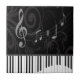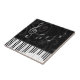 A whimsical musical design with curved piano keyboard keys and musical notes on a subtle flourish pattern in grey on a black background. Ideal for the pianist, piano student or the piano lover.