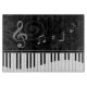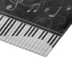 A whimsical musical design with curved piano keyboard keys and musical notes on a subtle flourish pattern in grey on a black background. Ideal for the pianist, piano student or the piano lover.